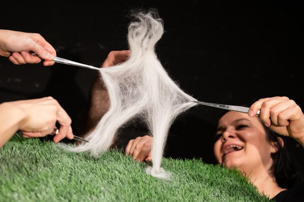 Ivana Macková: Väčšinou mám na začiatku tvorby nejakú vizuálnu predstavu, ktorú následne začnem zhmotňovať vo vybranom materiáli. Materiál je kľúčový, pretože ovplyvňuje pohyb bábky. Sú prípady, keď veľmi jednoduchý nápad, ktorý vtipne vyjadrí myšlienku, môže byť efektnejší ako nejaká zložitá technológia. Napríklad postava Yetiho, ktorú sme potrebovali vytvoriť do inscenácie Neviditeľní pre Bratislavské bábkové divadlo, nám najlepšie fungovala ako guča chlpatého bieleho materiálu, z ktorej bábkoherečky pomocou pinziet vyťahovali jednotlivé končatiny a následne ich pinzetami aj animovali. Sú momenty, keď sa obyčajný materiál mení na bábku len pôsobením bábkohercov.