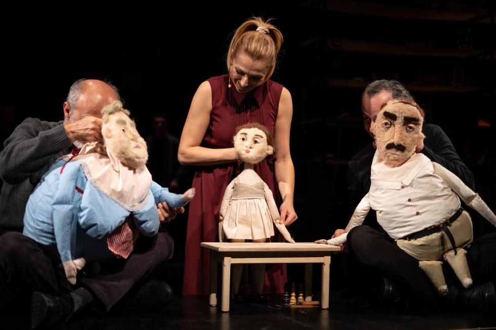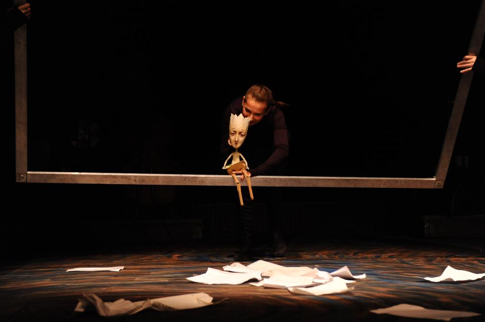 Olga Ziębińska: Při vizuální tvorbě představení začínáme vždy tvorbou scénografie. Z toho, jak scénografie vypadá, se pak vyvíjí i podoba loutek.Výchozím bodem vizuální tvorby je většinou volba materiálů. Ty určují styl, funkčnost a symbolický význam inscenace. Když už máme vymyšlenou scénografii a zvolené konkrétní materiály, většinou ani nemusíme řešit, jaký druh loutek použijeme – to totiž často vyplyne samo z vizuálního řešení inscenace. Kromě výtvarné stránky je potřeba zohlednit i praktičtější aspekty, jakými jsou velikost scény, její vzdálenost od diváků, počet diváků v hledišti či samotný typ hlediště. Loutka je funkční tehdy, když dokáže komunikovat stejným vizuálním jazykem jako ostatní objekty na scéně, když patří do téhož světa a řídí se stejnou logikou. Samozřejmě je důležité i to, aby byla dobře viditelná a aby s ní herec uměl hrát. Právě při prvních hereckých zkouškách obvykle dochází k největším úpravám. Loutka má ožít v rukou herců, nikoliv technologů či scénografů, a právě herci tak mají většinou poslední slovo v tom, zda je loutka funkční nebo ne. Nicméně je možné s nimi o některých věcech jednat a hledat kompromis. Stalo se mi například, že jsem vyráběla loutky z polštářů a peří. Protože jsem s tímto materiálem strávila při výrobě spoustu času, do jisté míry jsem se s ním sžila. Měla jsem jasnou představu, jak se s těmito loutkami manipuluje. Nebyly to běžné marionety a bylo třeba naučit se s nimi zacházet jinak, spíše jako s polštářem než jako s klasickou loutkou. Pracovalo se s nimi mačkáním, přemisťováním a přetlačováním peří z jedné části polštáře do druhé, díky čemuž loutky získávaly nové výrazy a gesta. Sice neuměly například chodit, ale dokázaly se shrbit, nafouknout nebo působit utrápeně či vztekle. Tehdy, i když mi herci namítali, že loutky nejsou funkční, jsem je dokázala přesvědčit, aby se na ten materiál podívali jiným způsobem a naučili se s ním pracovat.