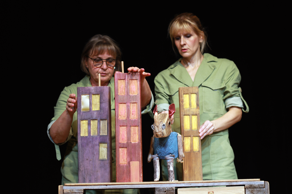 V úvode predstavenia vítajú bábkoherečky Margaréta Nosáľová a Miroslava Dudková oblečené vo svetlozelených kombinézach, vďaka čomu evokujú pracovníčky zoologickej záhrady, predovšetkým detské publikum. Po krátkom výstupe o dôležitosti delenia vecí rovným dielom rozdávajú divákom mince, ktoré využijú neskôr v priebehu deja, aby pomohli malému nosorožcovi Rinovi dostať sa do Afriky.